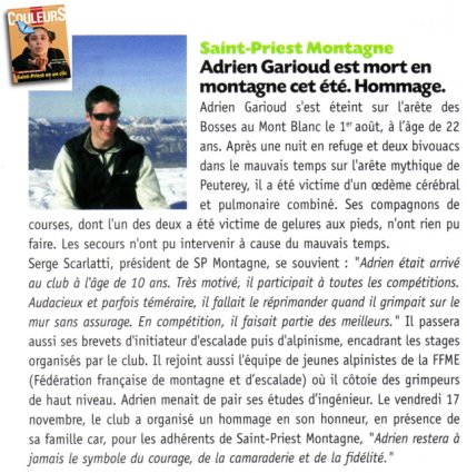 Adrien et deux copains ont été surpris par du mauvais temps dans "l'intégrale de Peuterey" au Mont Blanc. Adrien est mort d’ un oedème combiné cérébral et pulmonaire, il n’avait que 22 ans.